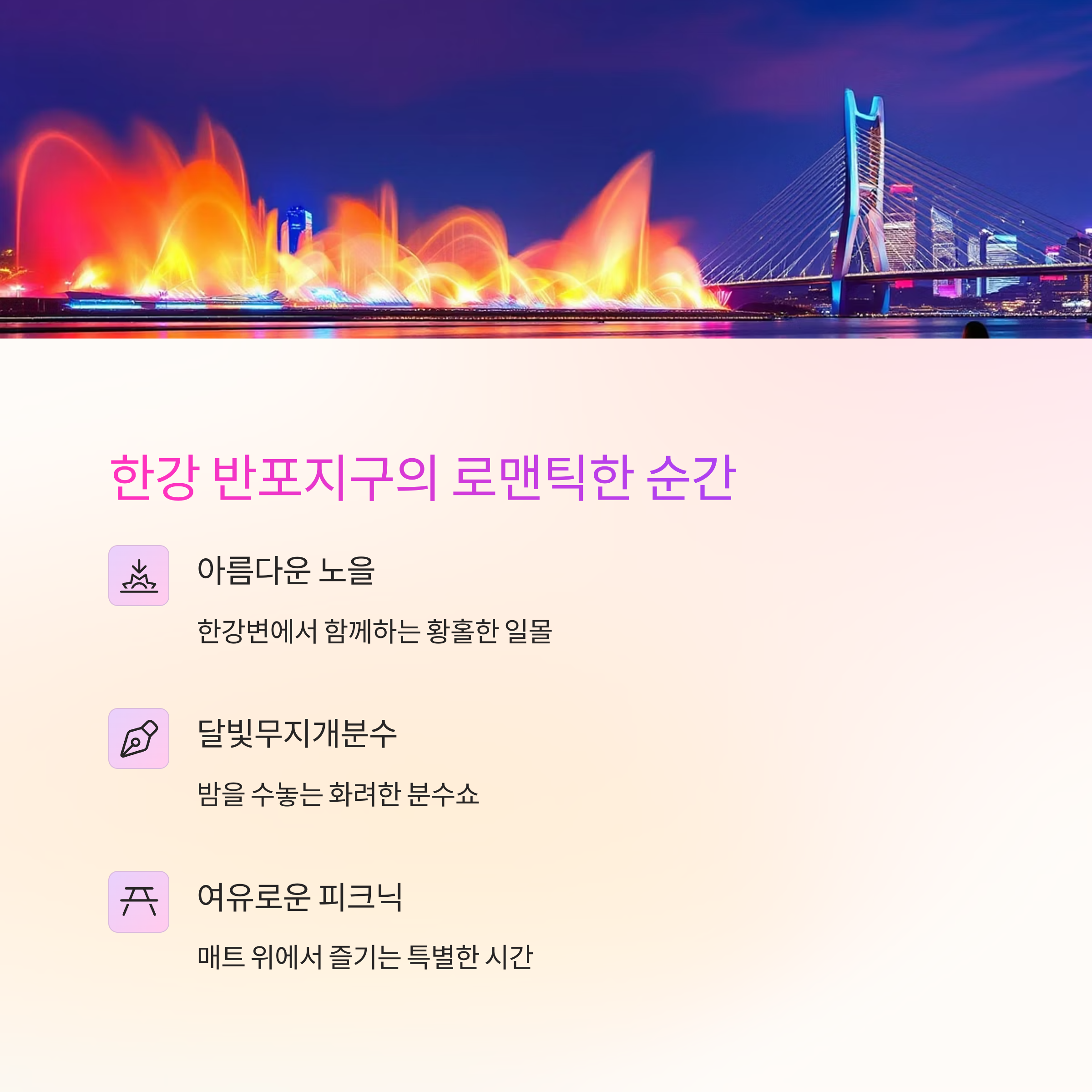 한강 반포지구: 노을과 분수가 있는 로맨틱 스팟