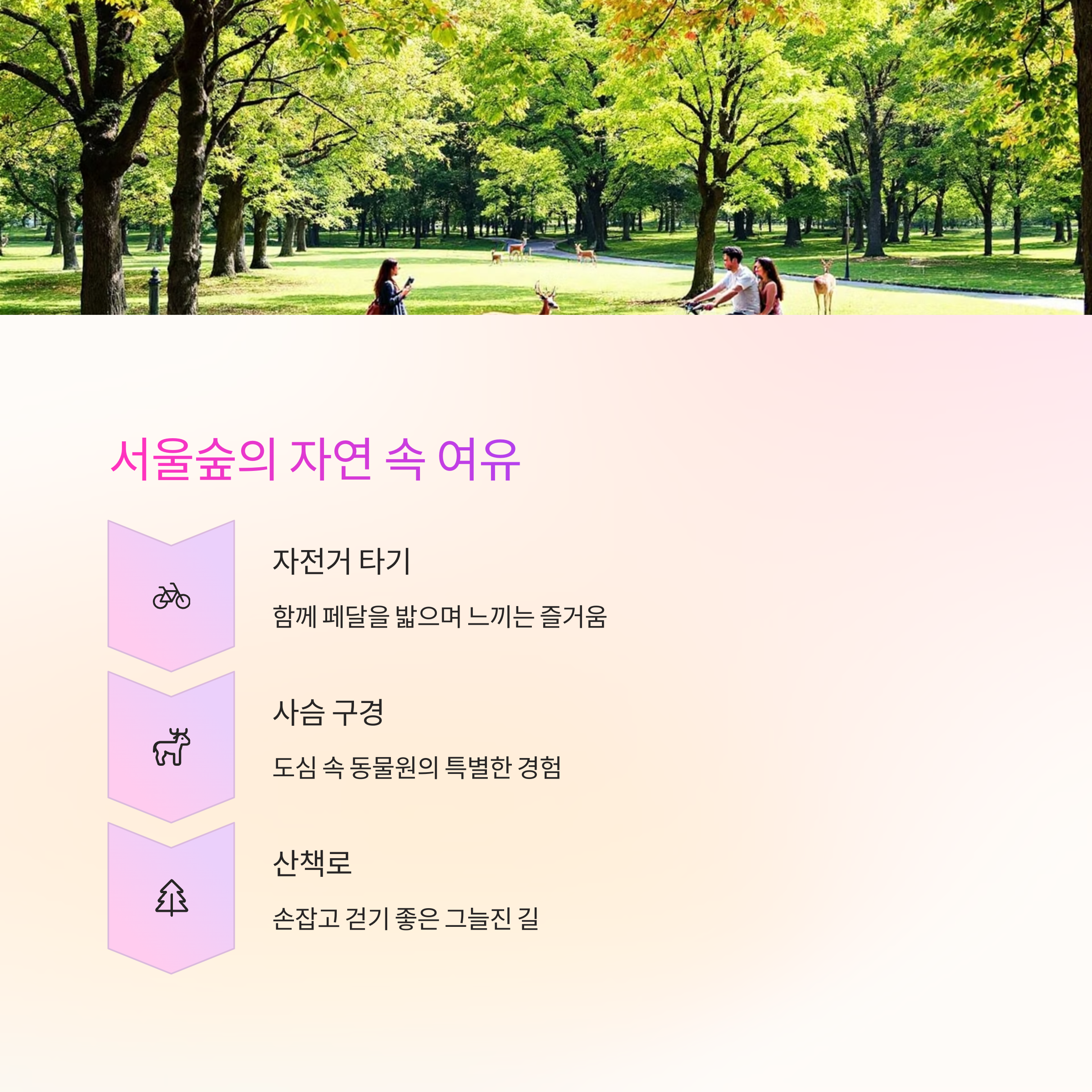 자전거를 함께 타거나 사슴을 구경할 수 있는 서울숲은