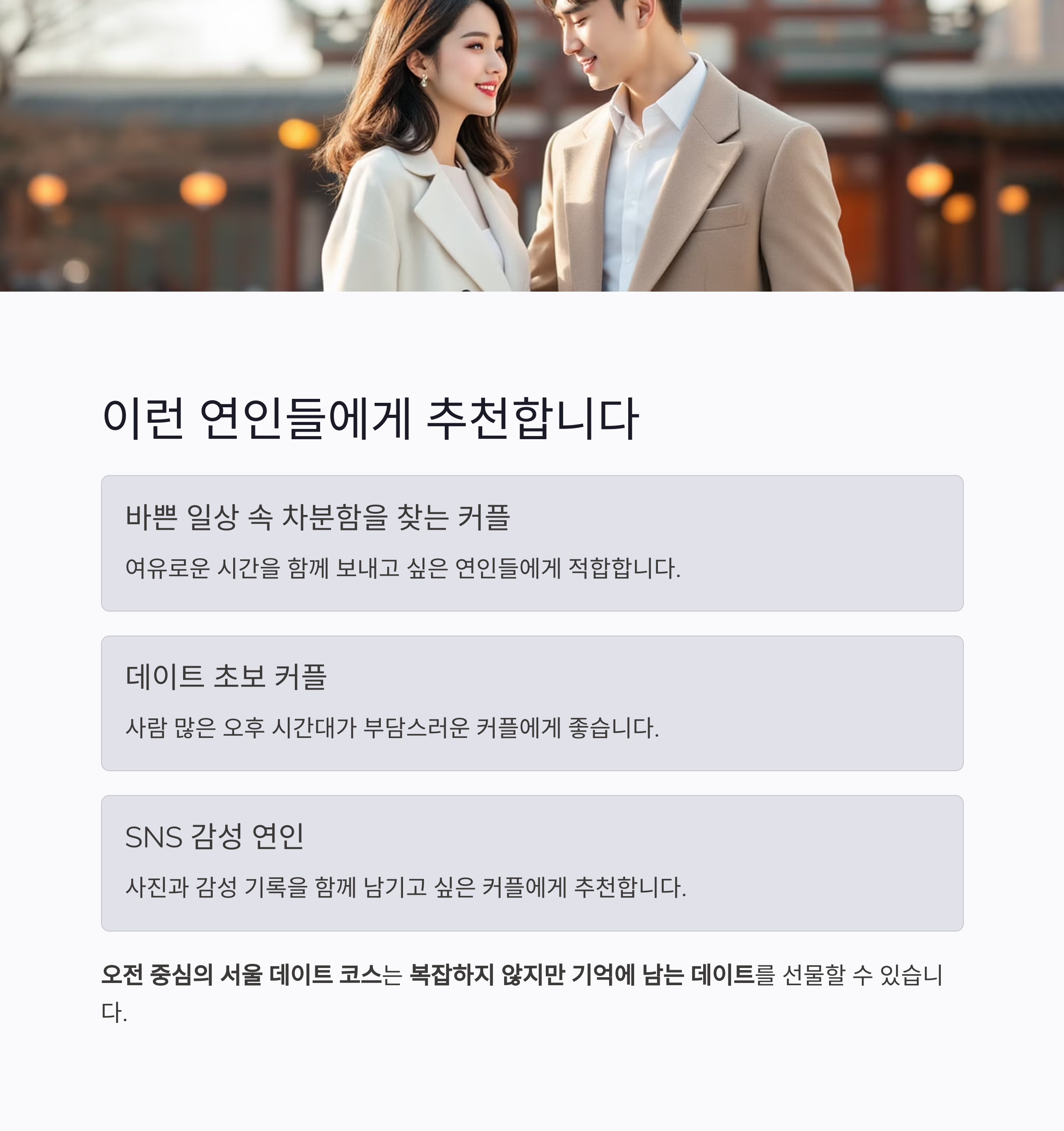 | 서울 데이트 명소, 시간대별 완벽 공략법 (2) | 2025.06.11 |