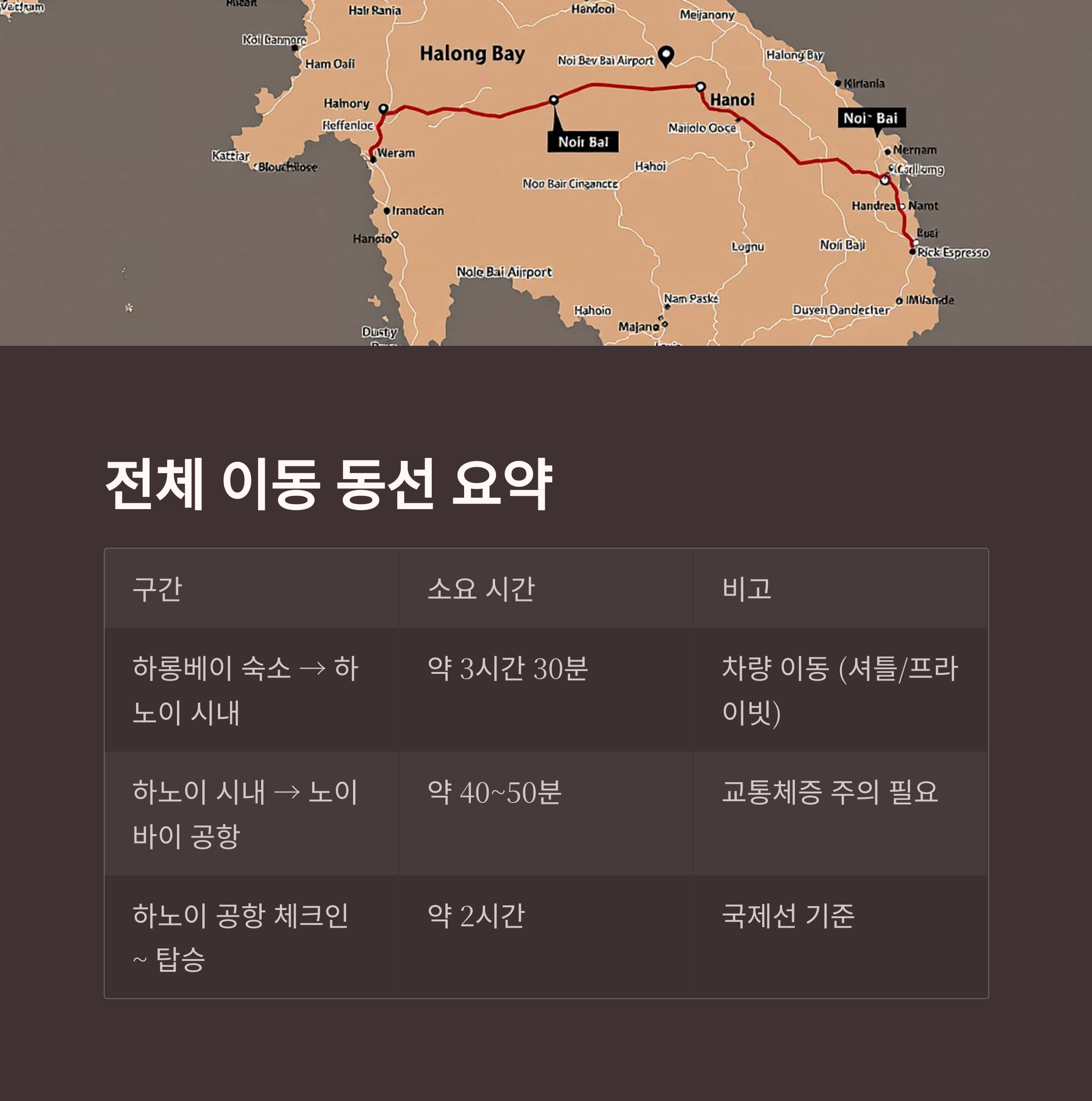| 하노이 시내 → 노이바이 공항 | 약 40~50분 | 교통체증 주의 필요 |