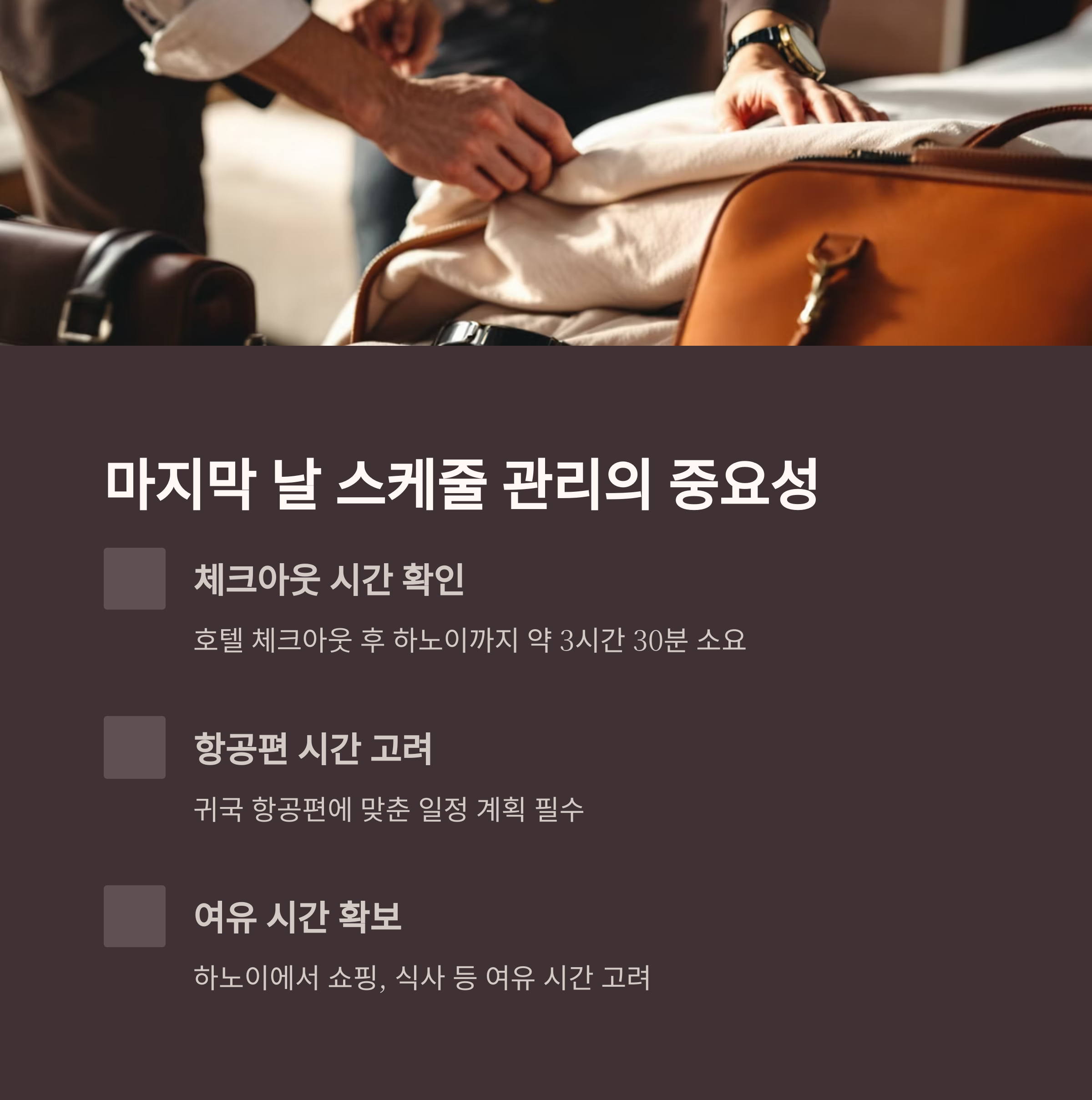 귀국 항공편 시간에 맞춘 스케줄 관리가 중요합니다.