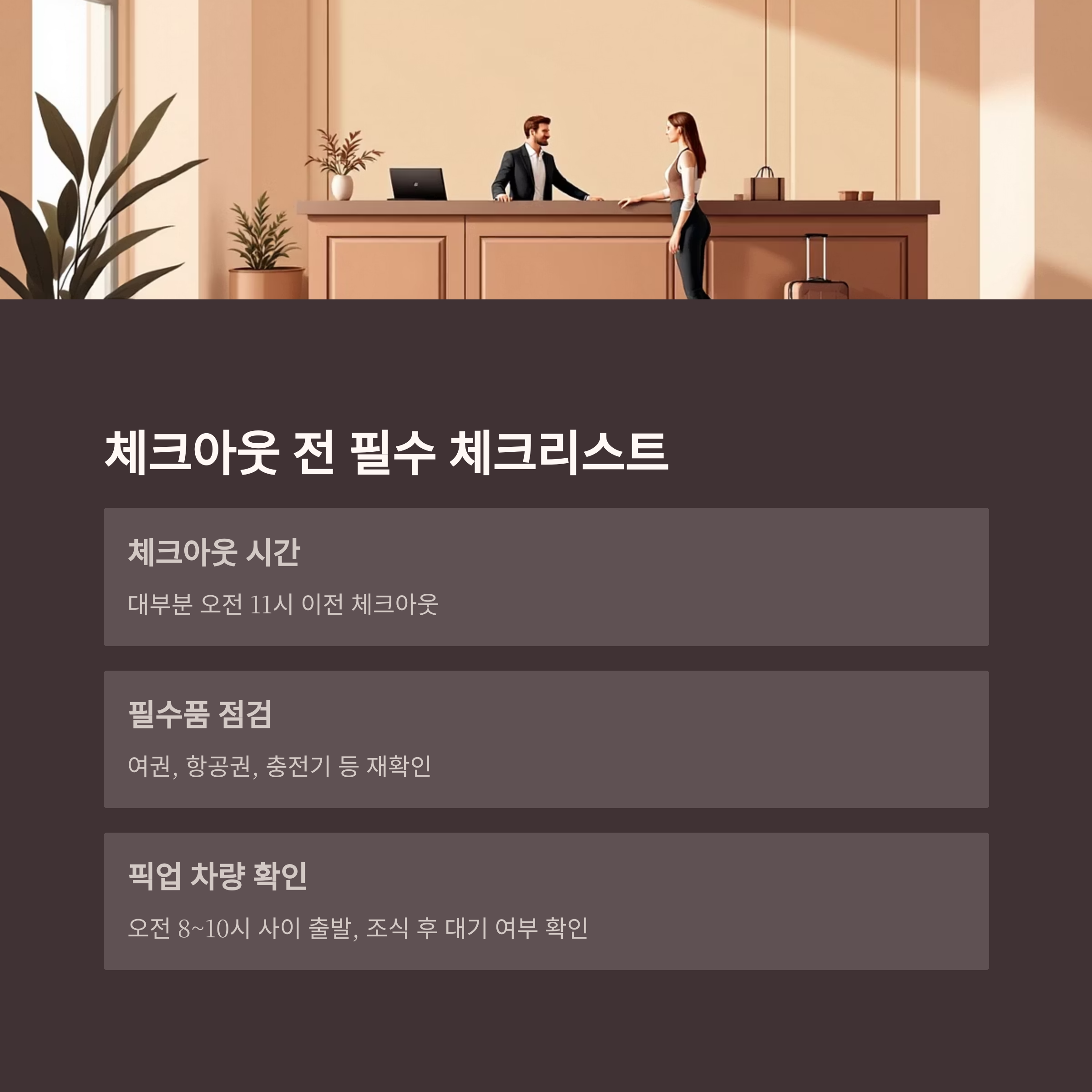 숙소 체크아웃 전, 여권·항공권·충전기 등 필수품을 다시 한번 점검하세요