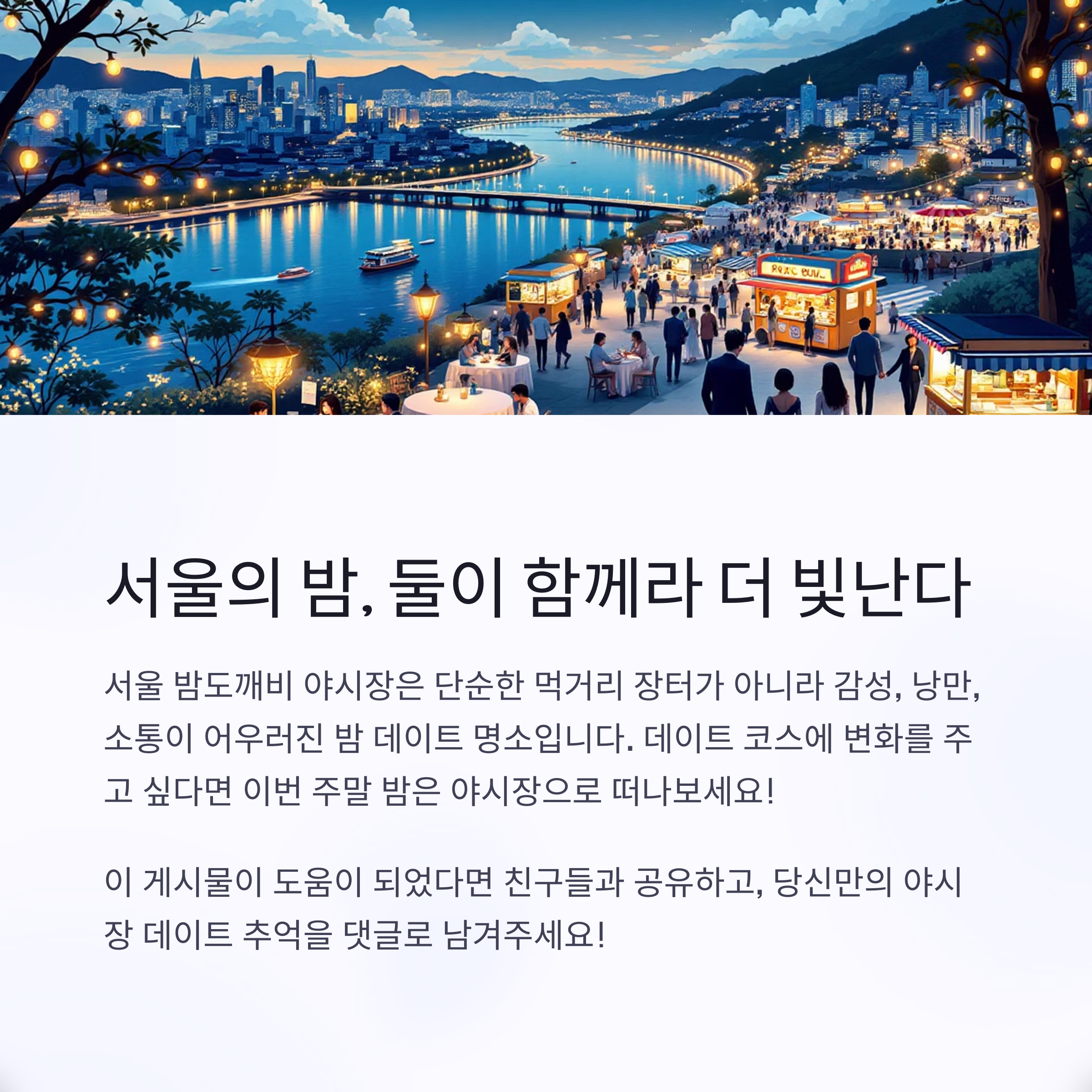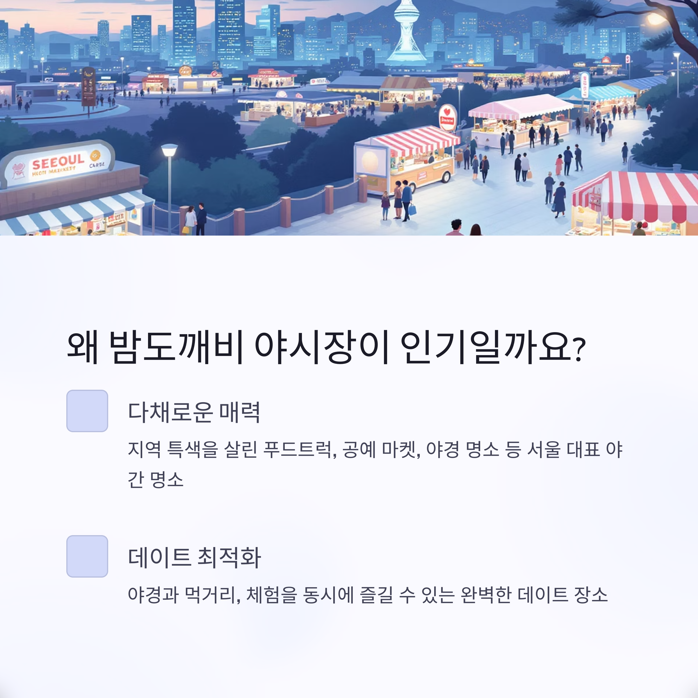 이번 글에서는 서울 주요 밤도깨비 야시장과 추천 동선, 데이트 팁을 모두 알려드립니다.