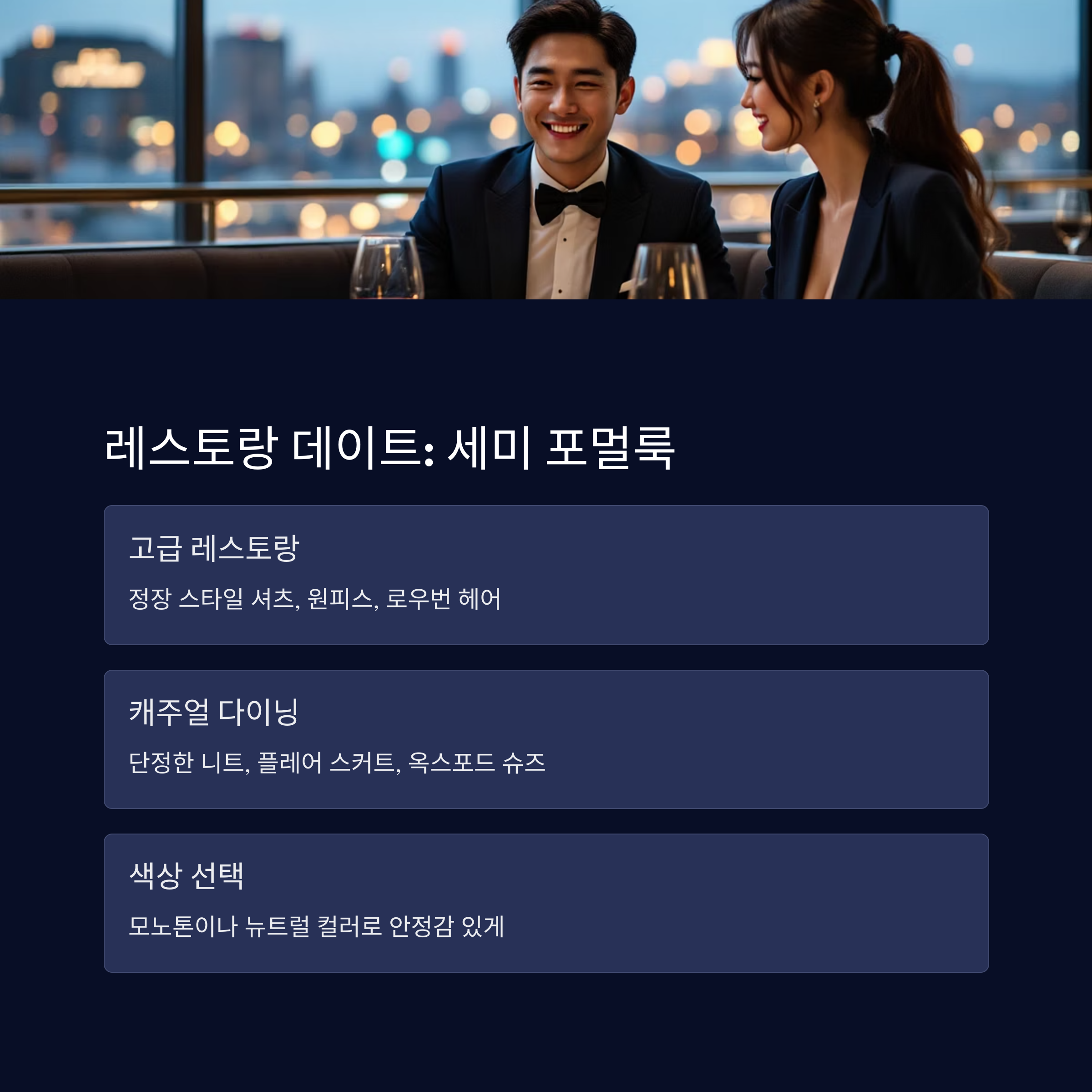 | 고급 레스토랑 | 정장 스타일 셔츠, 원피스, 로우번 헤어 |