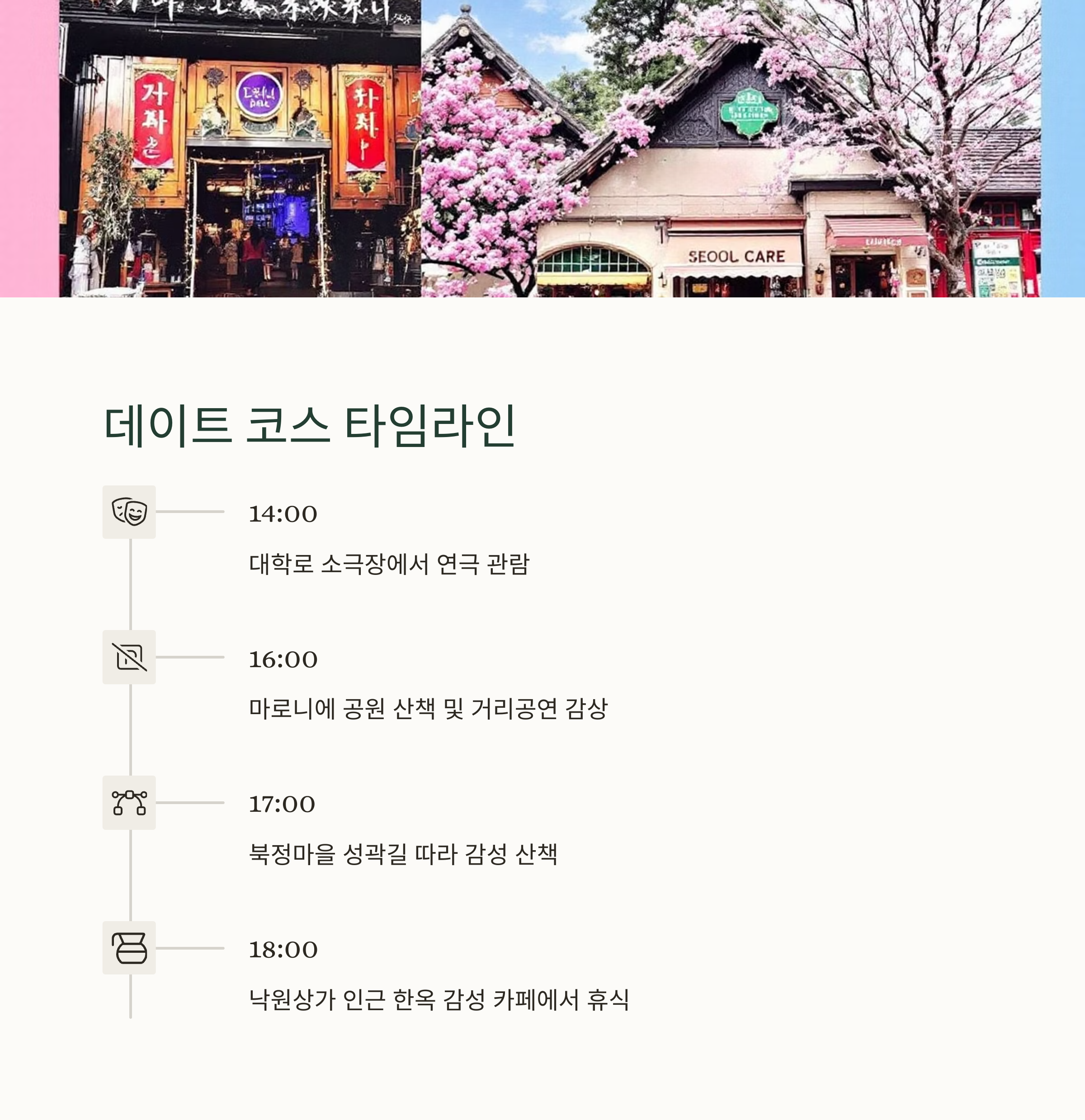 대학로 연극 – 마로니에 공원 산책 – 북정마을 골목길 – 감성 카페 마무리