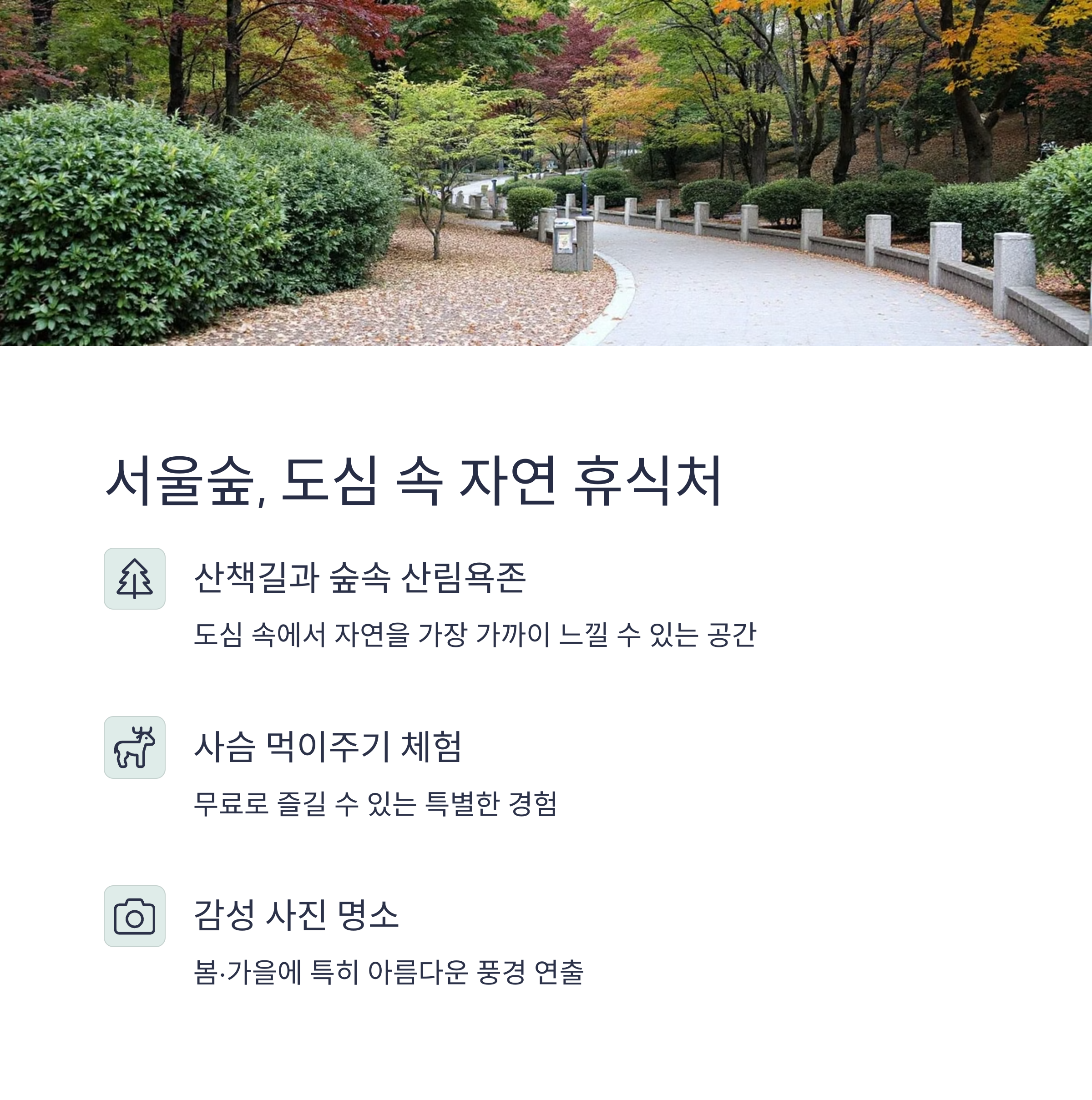| 서울숲 | 자연 속 산책, 사슴 체험 | 오전 ~ 오후 |