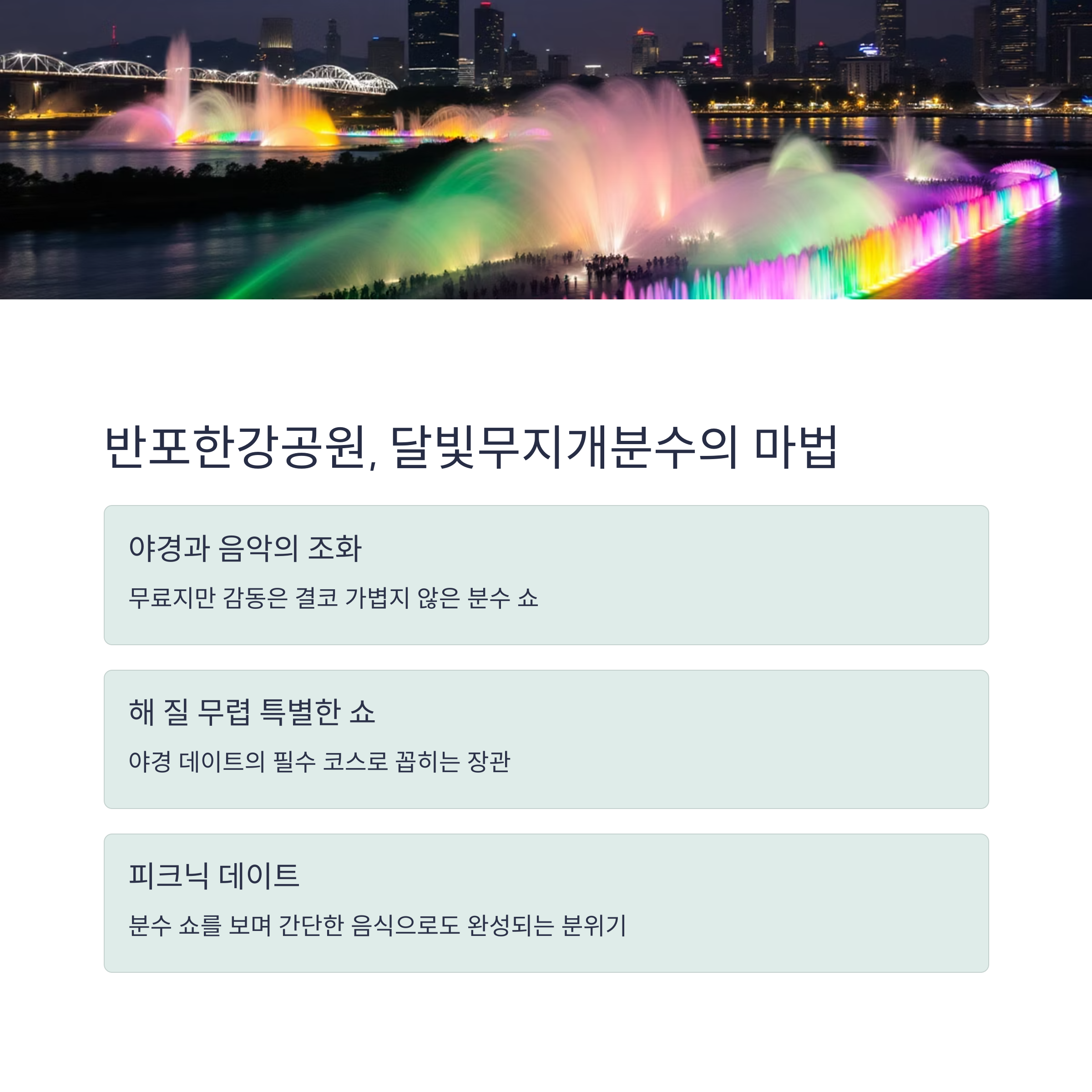 | 반포 한강공원 | 야경, 분수쇼 | 일몰 이후 |