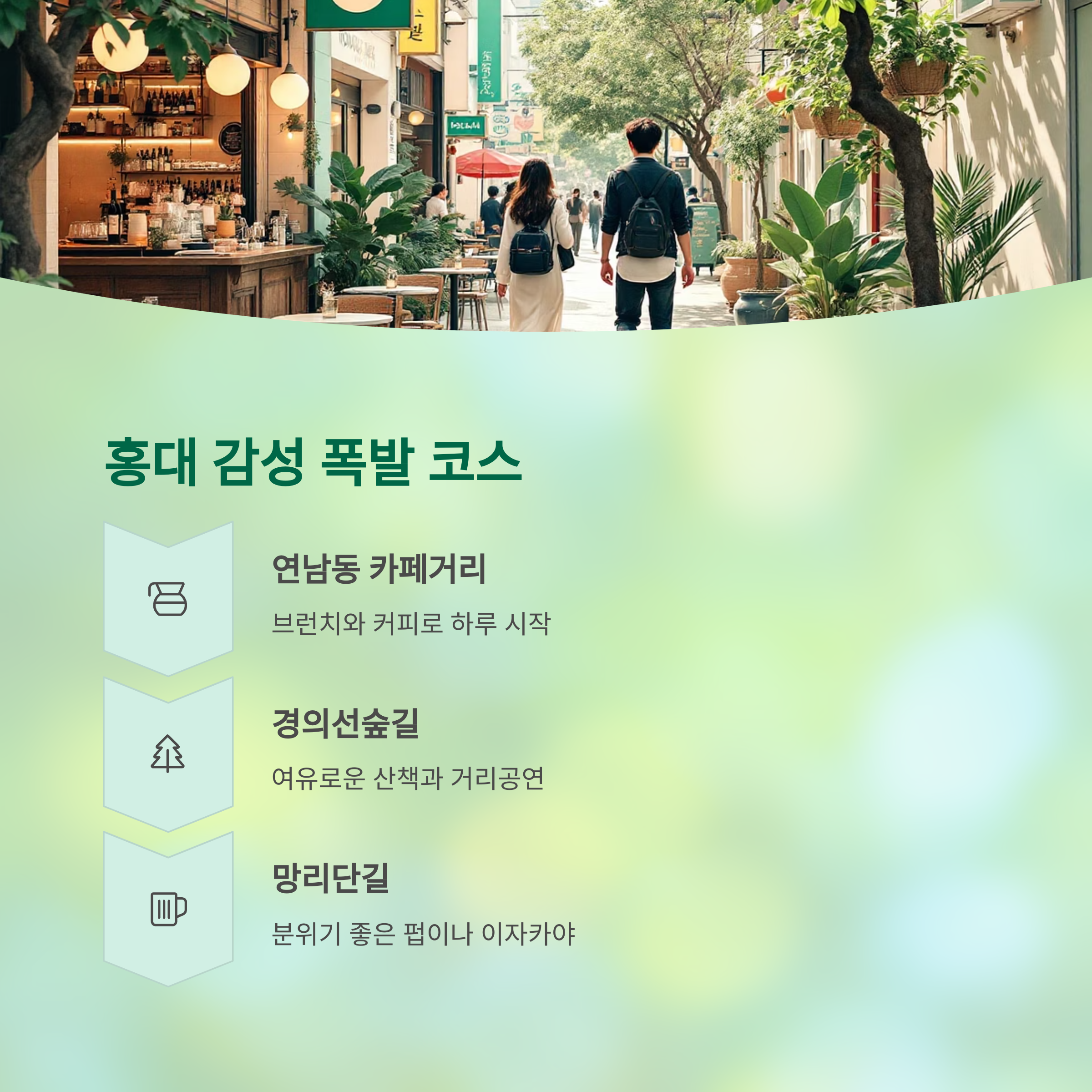 | 홍대 | 연남동, 경의선숲길 | 산책, 카페, 소품샵 |
