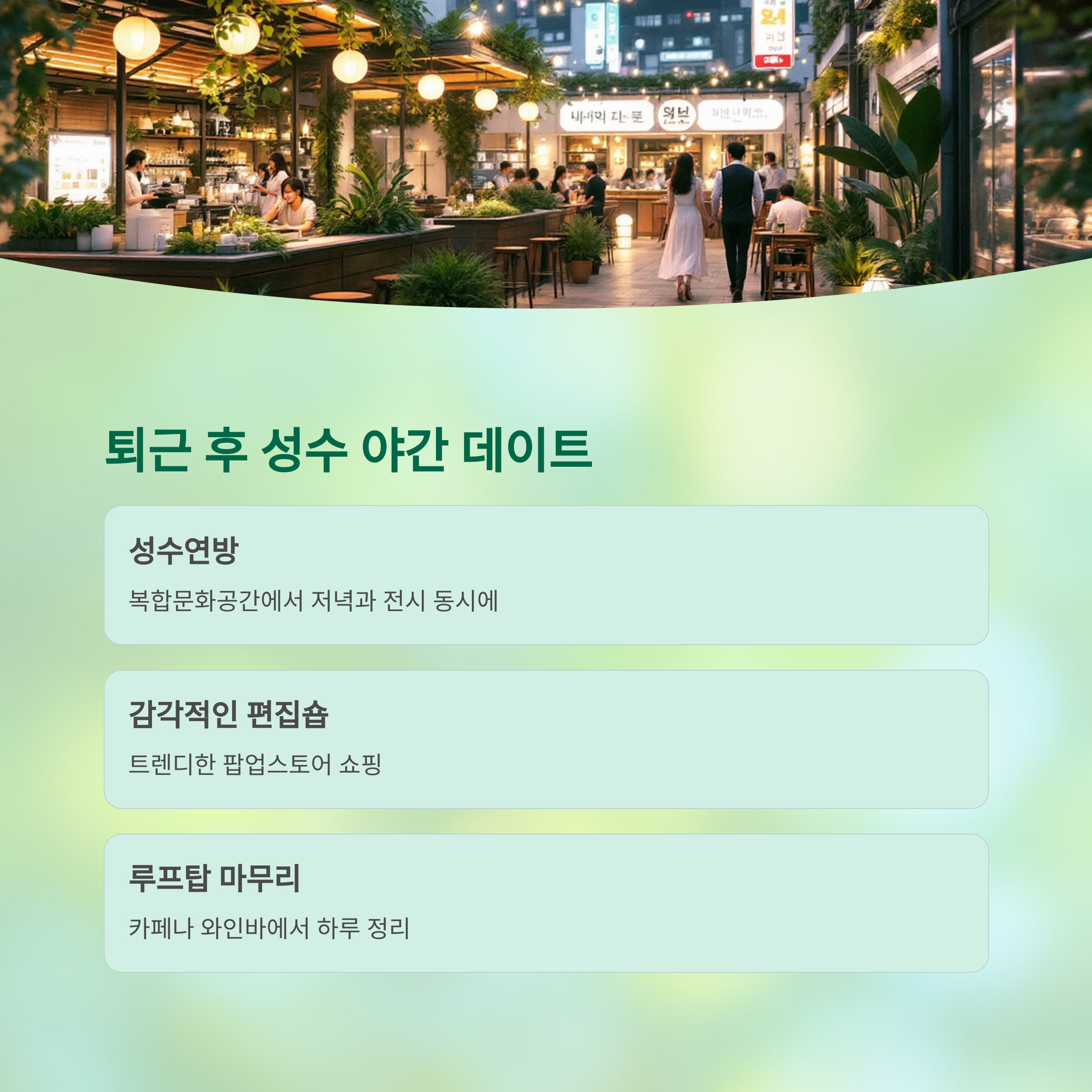 | 성수 | 성수연방, 루프탑 | 전시, 쇼핑, 야경 |