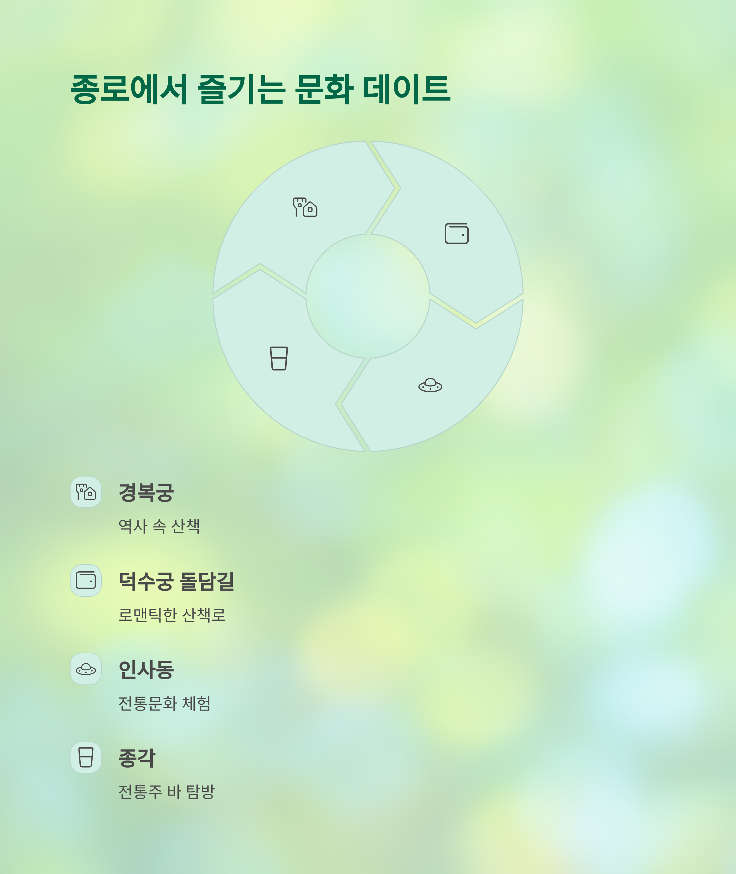 | 종로 | 경복궁, 인사동, 종각 | 문화체험, 전통주 탐방 |