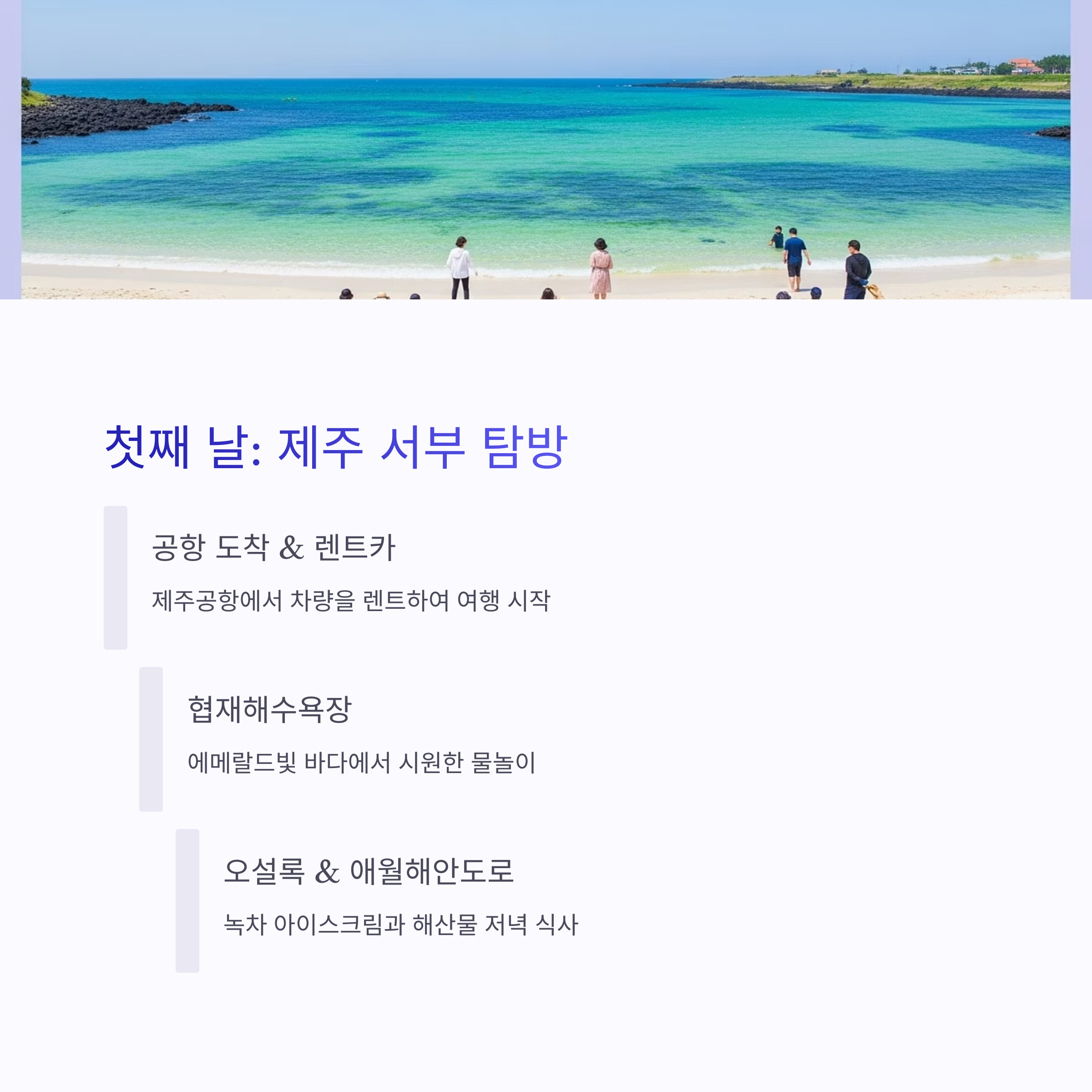 제주공항 도착 후 차량을 렌트하고, 협재해수욕장으로 이동해 시원한 물놀이와 해변 산책을 즐겨보세요. 오후에는 오설록 티뮤지엄에서 녹차 아이스크림을 맛보며 아이들과 함께 자연 속 차 문화 체험을 할 수 있습니다.