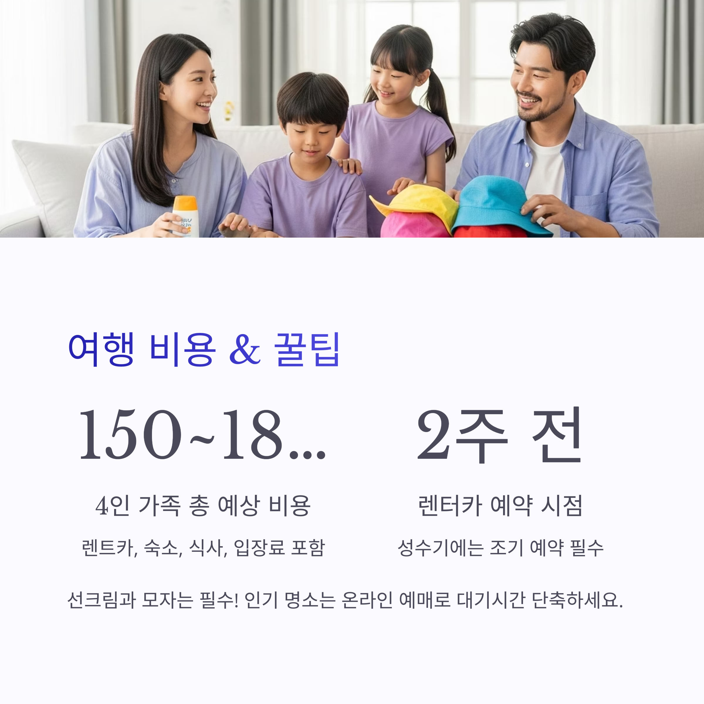 가족 4인을 기준으로 차량 렌트, 숙소, 식사, 입장료 등을 고려하면 약 150만 원에서 180만 원 정도의 예산이 필요합니다. 다만 여행 스타일에 따라 더 줄일 수도 있으며, 조기 예약과 할인 쿠폰을 잘 활용하면 비용 효율을 높일 수 있습니다.