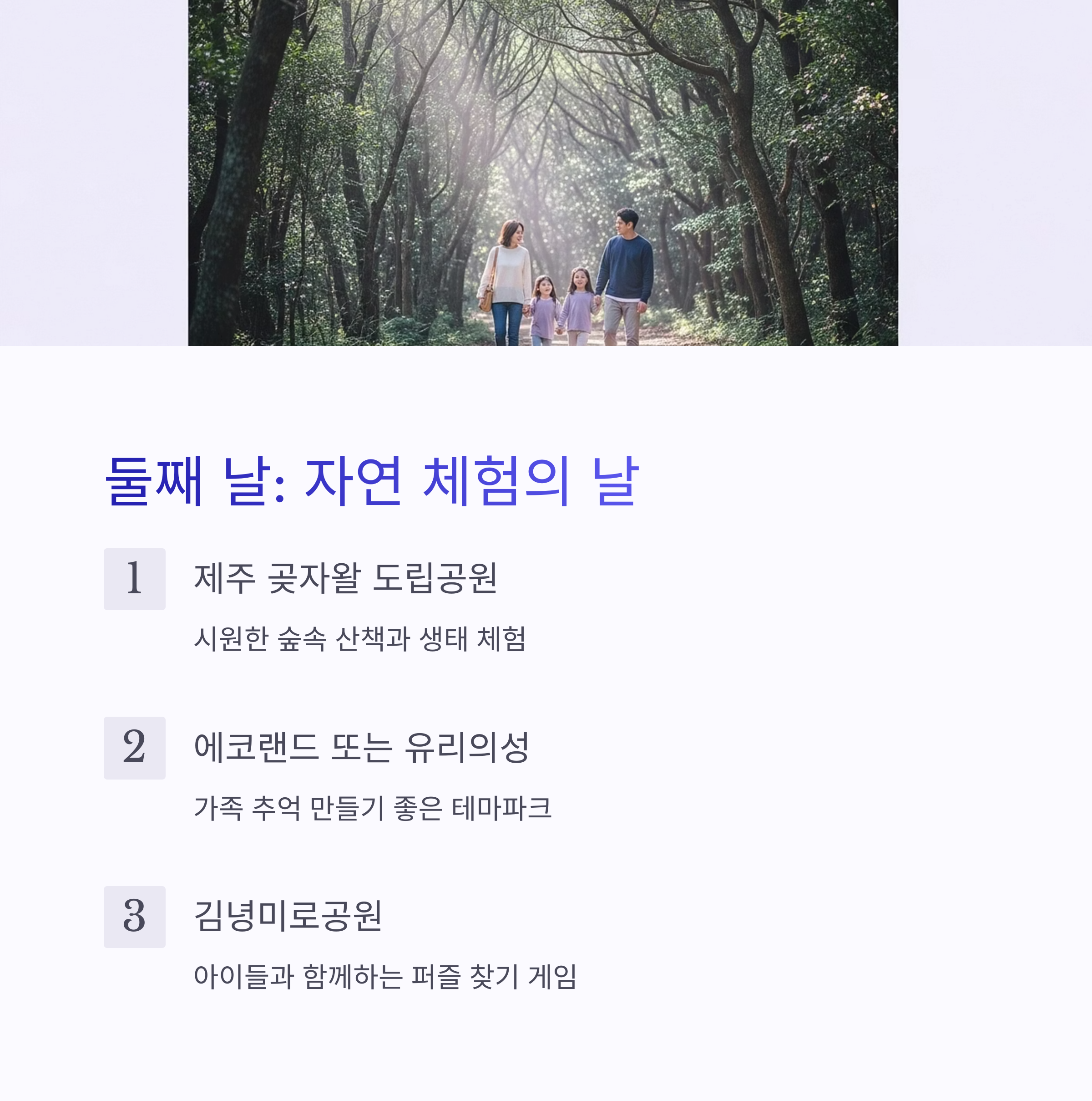 둘째 날은 한라산 중산간 지역 중심으로 구성합니다. 오전에는 '제주 곶자왈 도립공원'에서 시원한 숲속 산책과 생태 체험을 하고, 근처 '유리의성'이나 '에코랜드'에서 가족 사진을 남겨보세요.