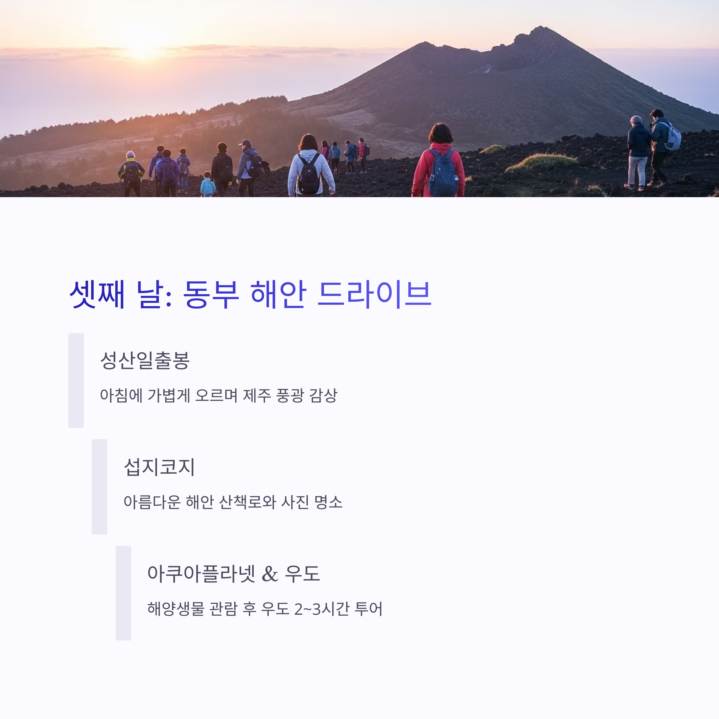 점심은 성산일출봉 인근 해산물 뷔페나 흑돼지 구이 전문점에서 해결하고, 오후에는 우도행 배를 타고 2~3시간 우도 투어를 진행하세요.