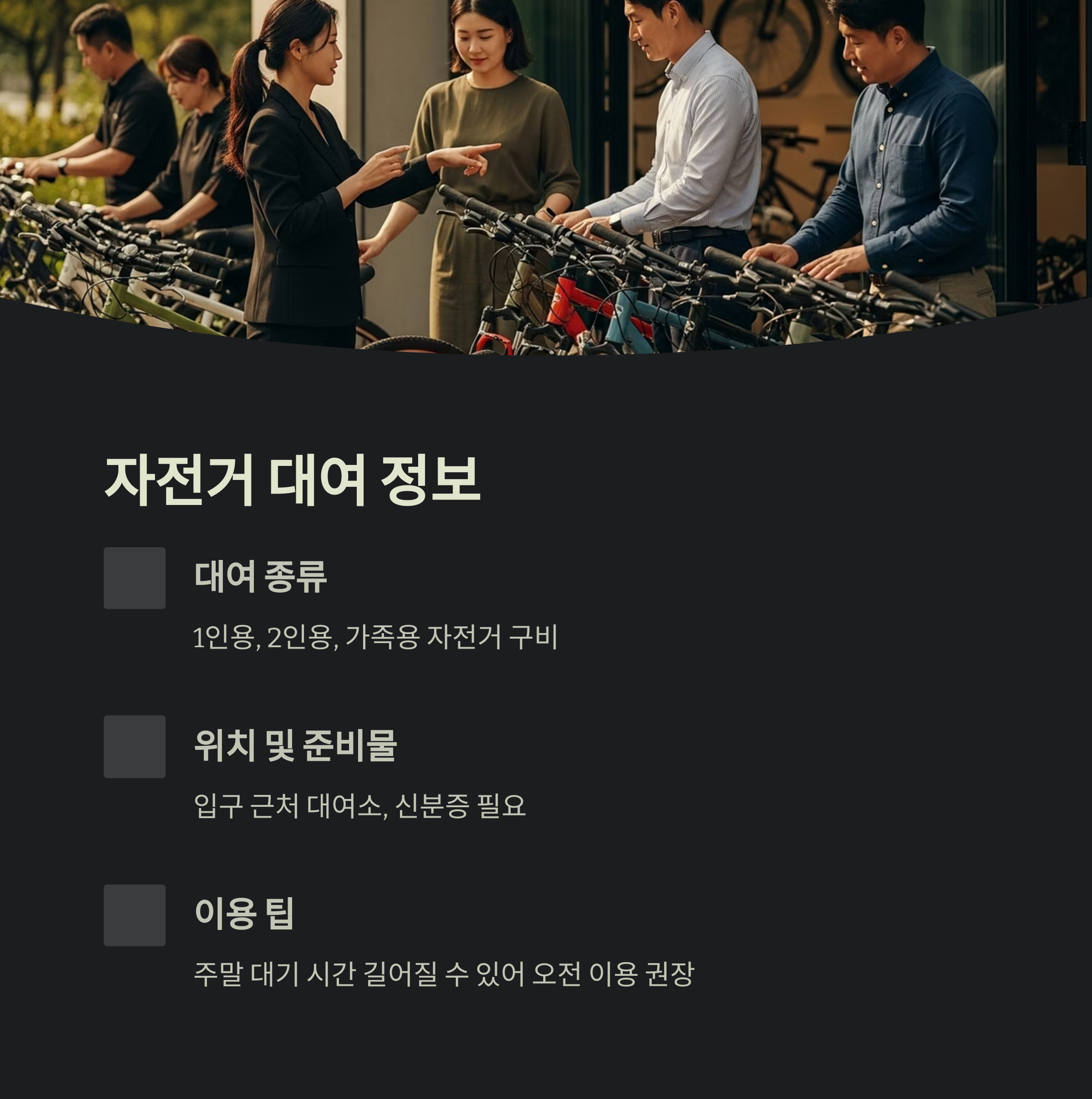 남이섬 내 자전거 대여는 1인용, 2인용, 가족용 등이 있으며