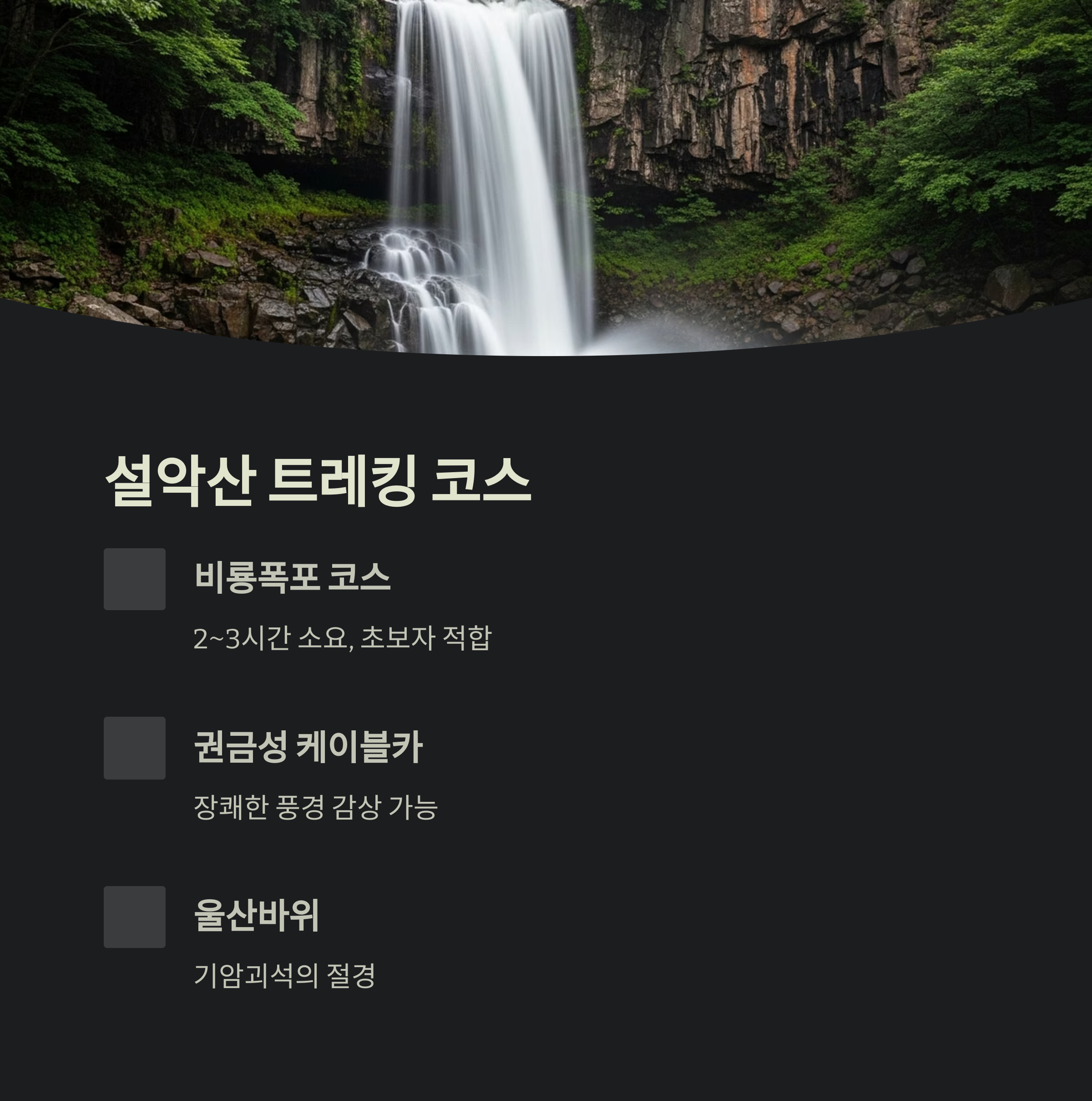 트레킹 코스로는 비룡폭포, 권금성 케이블카, 울산바위를 추천드립니다.