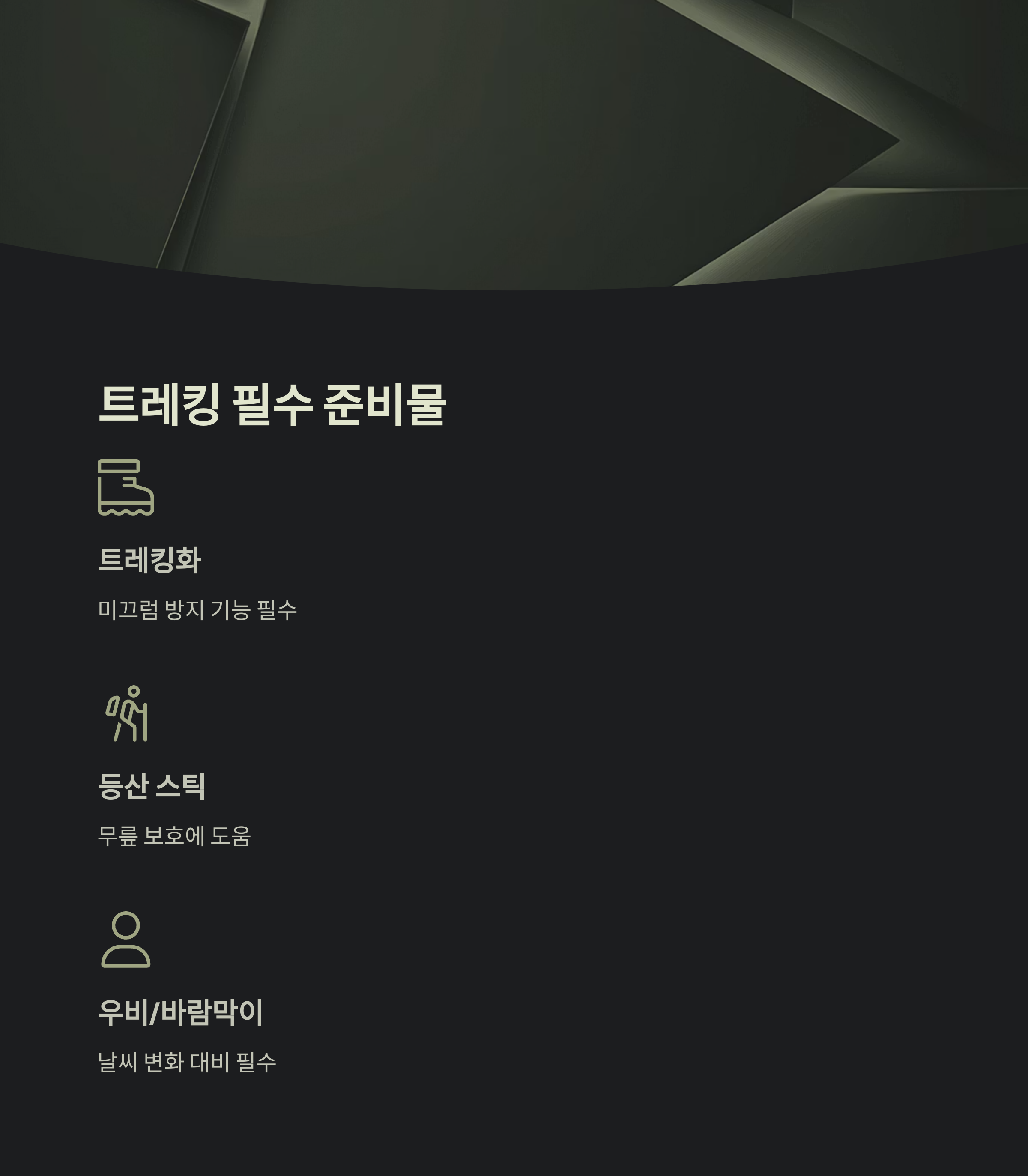 트레킹에 필요한 필수 장비는 다음과 같습니다.