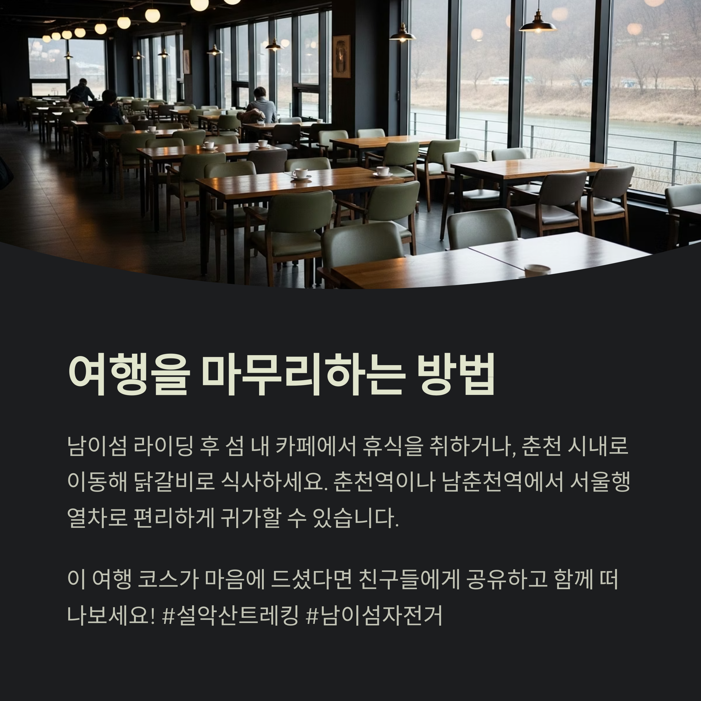 설악산의 시원한 공기와 장쾌한 풍경을 온몸으로 느낀 후, 남이섬의 강변 자전거길을 달리며 마무리하는 1박 2일 여행 코스를 소개합니다. 걷고, 쉬고, 달리는 이 여행은 자연과 함께하는 힐링의 정수를 보여줍니다. 가족, 친구, 연인 누구와 떠나도 좋은 일정이며, 체력 부담도 적어 초보자도 도전하기에 안성맞춤입니다.