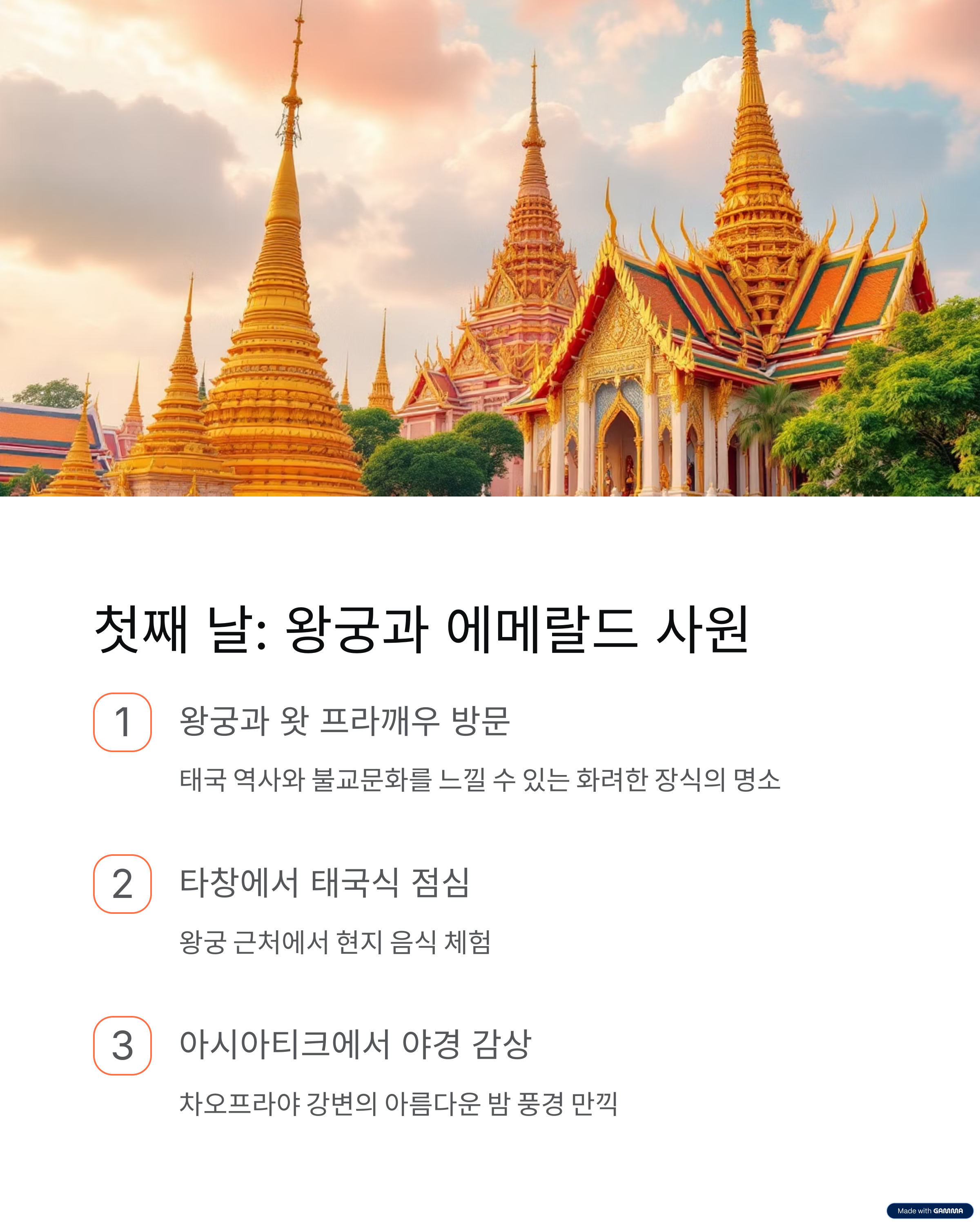 위 일정은 방콕의 핵심 스팟을 효율적으로