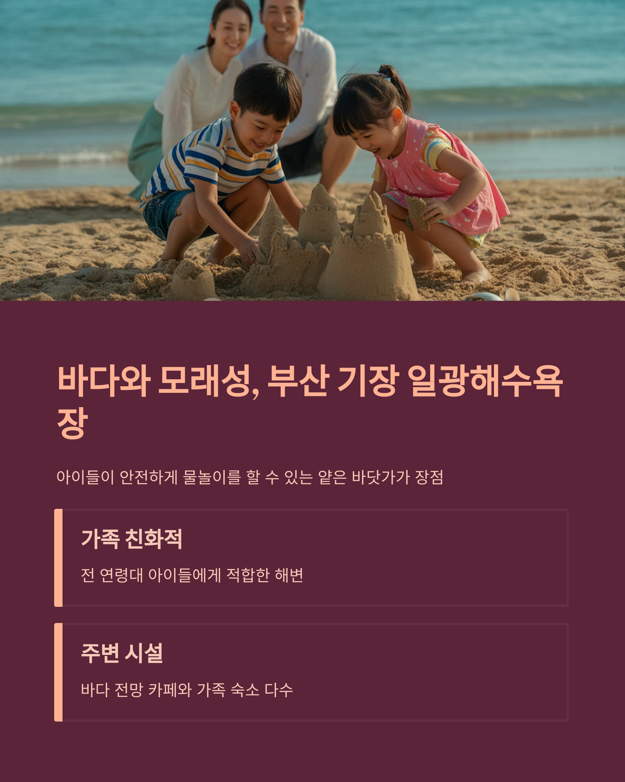 아이들이 안전하게 물놀이를 할 수 있는 얕은 바닷가가 장점입니다.