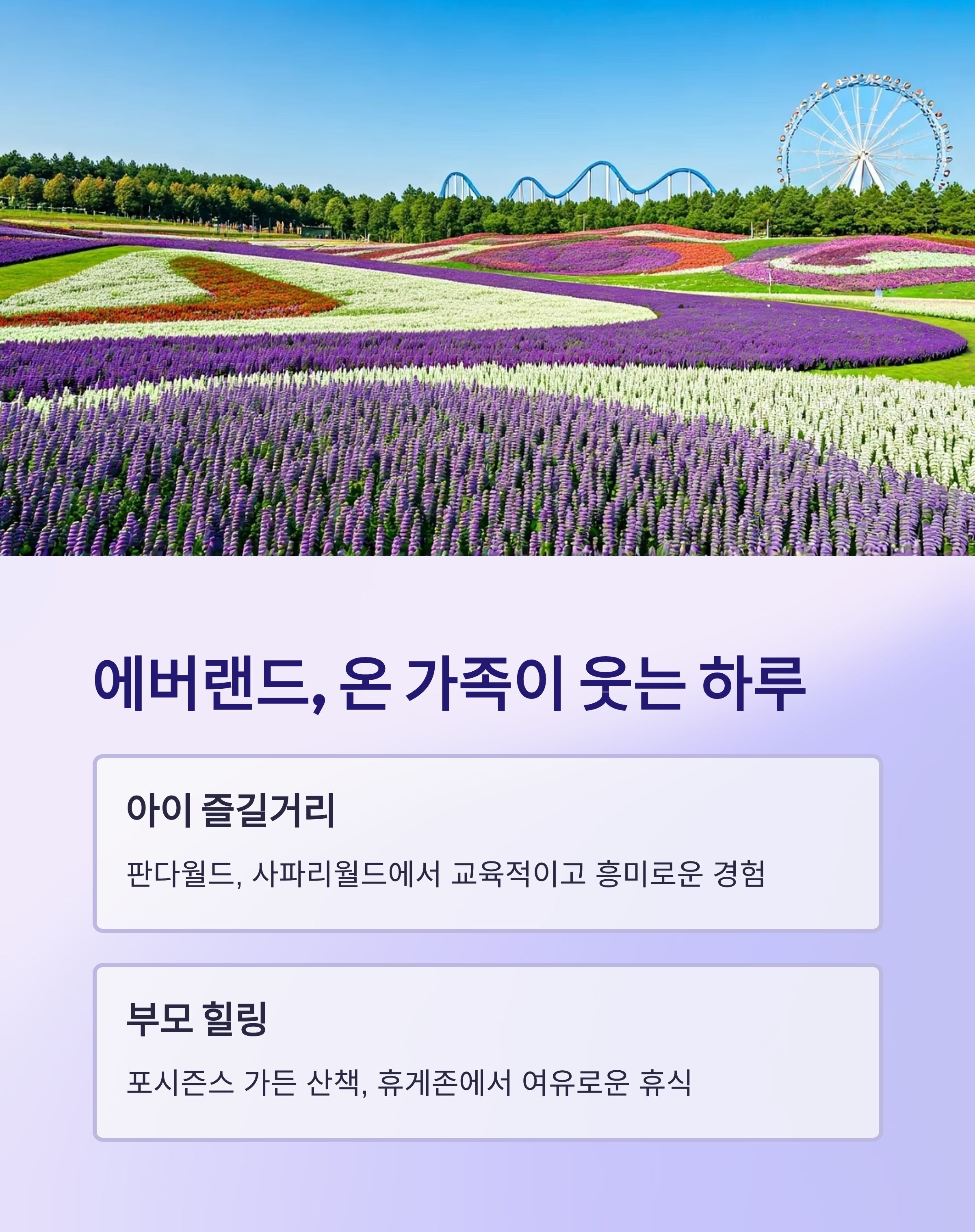 에버랜드는 놀이공원의 대표주자로, 다양한 연령대를 위한 놀이기구와 테마 존이 마련되어 있습니다.