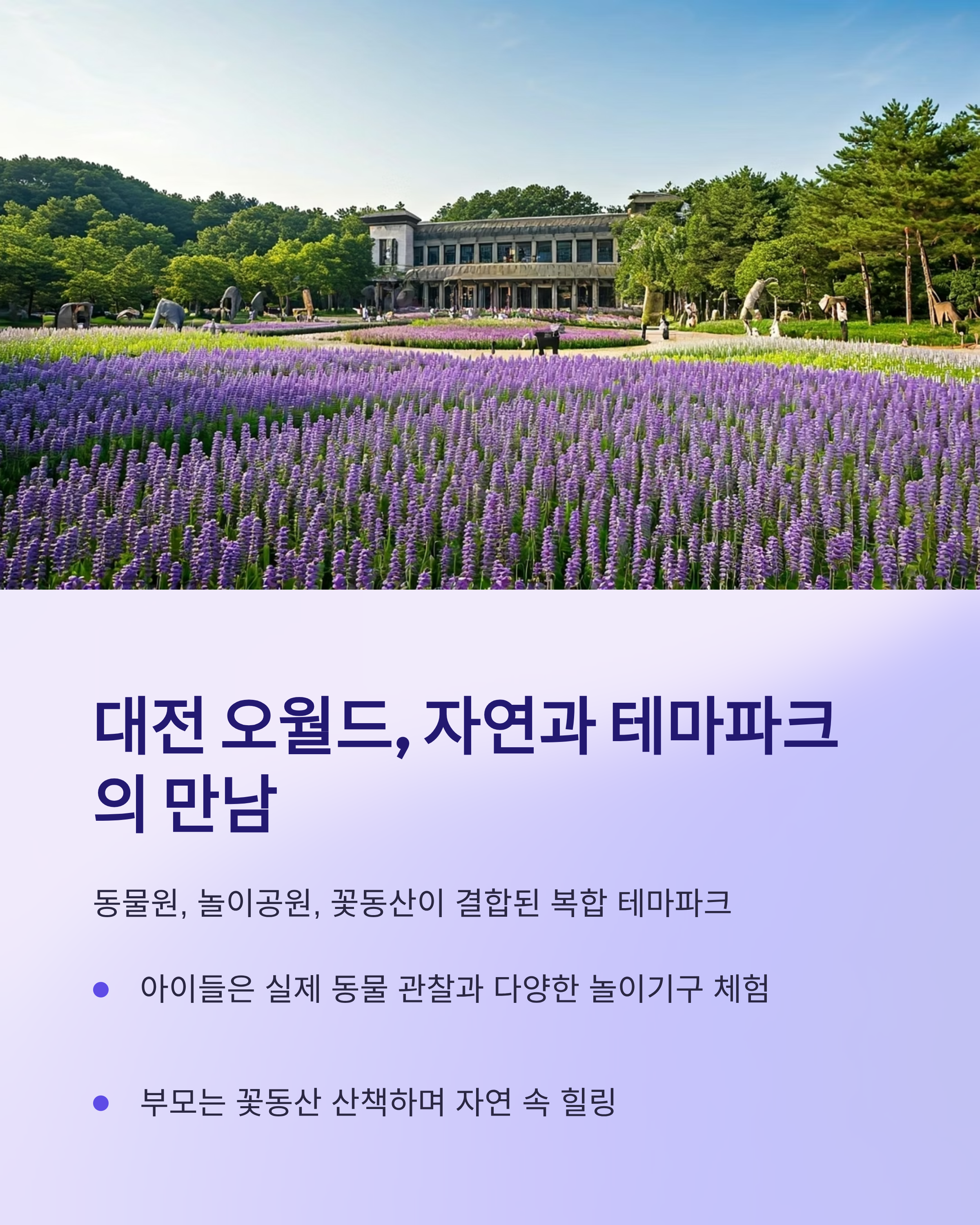 대전 오월드는 동물원, 놀이공원, 꽃동산이 결합된 복합 테마파크입니다.